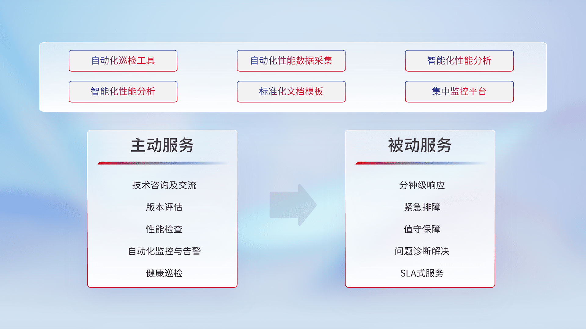 智能化工具和标准化文档,,,保障服务质量,,,,提供主动服务(包含技术咨询、、版本评估、、性能检查、、自动化监控与告警、、、健康巡检)和被动服务包含(分钟级响应、、、紧急排障、、、、值守保障、、问题诊断解决、、SLA服务)。。。